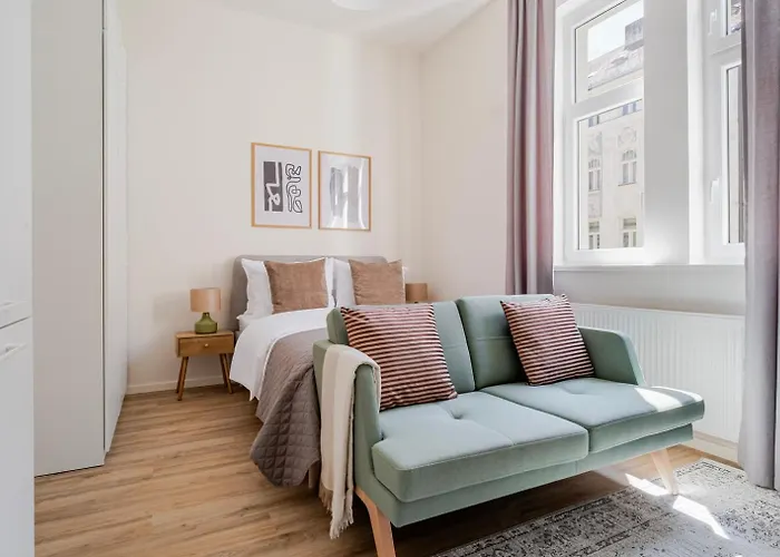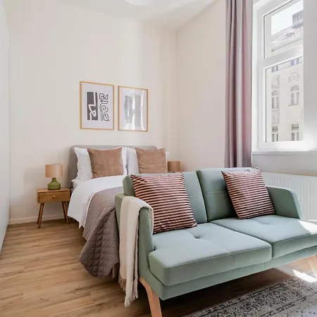 Apartament oferuje wygodne udogodnienia do samodzielnego przygotowywania posiłków, w tym pełnowymiarową kuchnię z przyborami kuchennymi i zmywarką do naczyń. Najbliższa stacja metra to Vltavska. Leży w odległości 10 min spacerem.